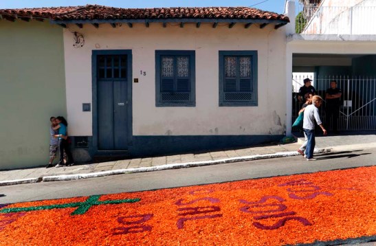 Santana de Parnaíba no dia de Corpus Christi em 2018, tendo ao fundo a Igreja Matriz de Santa Ana, construção do século XIX, em estilo eclético, com a fachada sendo restaurada.