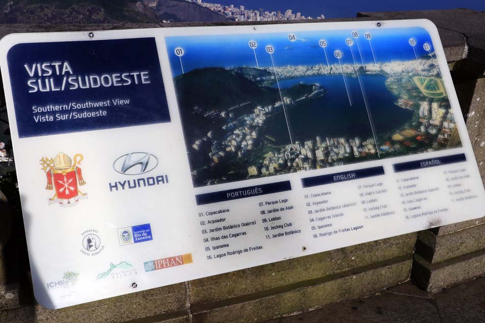 O topo do morro permite uma vista panorâmica do centro da cidade do Rio de Janeiro, do morro do Pão de Açúcar, da Lagoa Rodrigo de Freitas, da praia de Copacabana, da praia de Ipanema, do hipódromo da Gávea, da praia do Leblon, da enseada de Botafogo, do Aterro do Flamengo, do Maracanã e de vários bairros e favelas das zonas sul, norte e central da cidade. Recomenda-se que visitas ao pico do Corcovado sejam feitas em dias ensolarados para se evitar as nuvens que frequentemente impedem vistas claras. (Wikipédia)