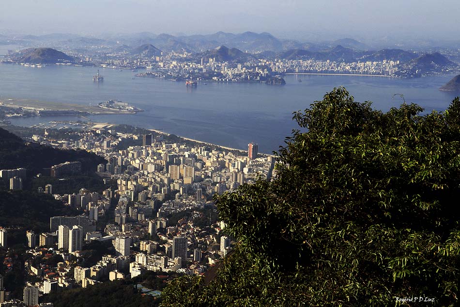À esquerda, o Aeroporto Santos Dumont para vôos domésticos. Do outro lado da baía, a cidade de Niterói.