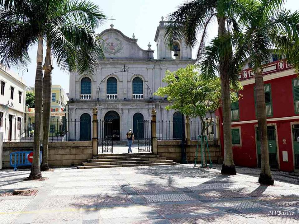Igreja de S. Lázaro, vista da Rua Nova de S. Lázaro. O espaço compreendido entre esta via e o muro de granito, com os degraus que dão acesso ao portão de ferro, é designado, na toponímia de Macau, por Adro de S. Lázaro. Nas duas moradias do lado direito, ainda se podem ver nas janelas do 1º andar, as adufas feitas de lâminas de conchas semi-transparentes, com caixilhos de madeira, usadas antigamente em Macau, em lugar de vidros. Foto: M.V. Basílio