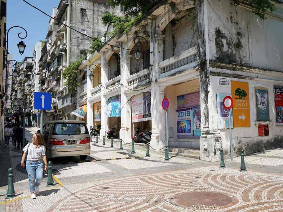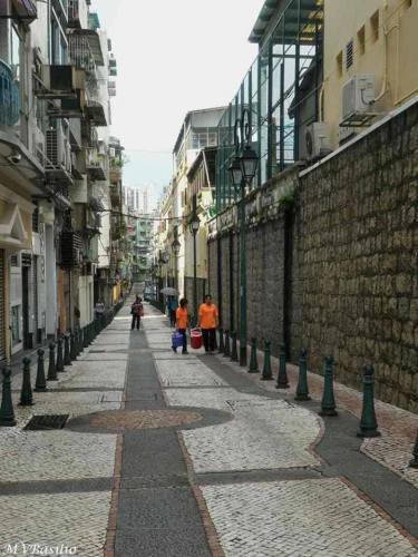 Abaixo: esq.-fachada do prédio No. 7 da Calçada da Igreja de S. Lázaro. Presentemente, o prédio alberga a Casa de Arte Tai Fông T’óng (大瘋堂藝舍), que faz parte da Zona de Indústrias Culturais e Criativas da Freguesia de São Lázaro / dir.-um troço da Calçada da Igreja de S. Lázaro. No primeiro prédio do lado esquerdo, funciona presentemente a Escola de Música do Conservatório de Macau. Fotos: M.V. Basílio
