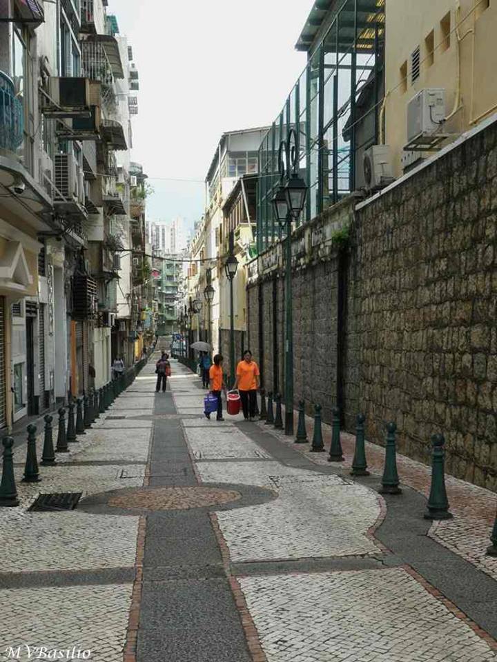 Calçada Central de S. Lázaro, em direcção à Rua do Volong, vendo-se do lado esquerdo duas antigas casas que ainda restam e, do lado direito, vários prédios de 5 ou mais pisos, que foram construídos após a demolição de antigas casas do Bairro de S. Lázaro. Foto: M.V. Basílio