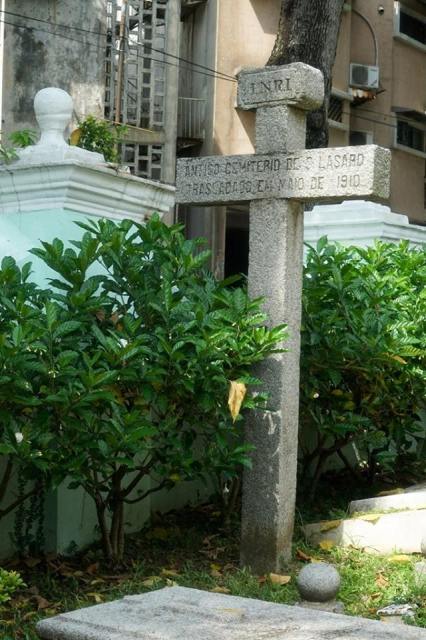 Uma cruz com a seguinte inscrição: ANTIGO CEMITERIO DE S. LASARO TRANSLADADO EM MAIO DE 1910. Durante muitos anos existiu um cemitério para cristãos chineses no Bairro de S. Lázaro, e quando foi encerrado, as campas foram transladadas para o Cemitério de S. Miguel Arcanjo. Aquela cruz serve apenas para assinalar a transladação que se efectuou em 1910. Foto: M.V. Basílio