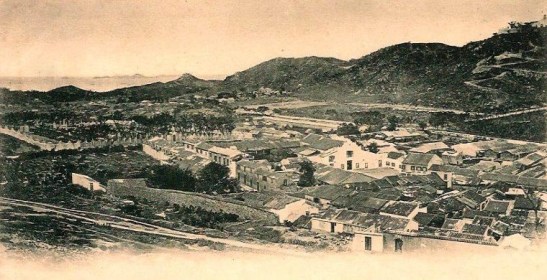 Vista geral do antigo Bairro de S. Lázaro, com a antiga igreja, demolida em 1885 e, em sua substituição, foi construída uma nova igreja no ano seguinte. Do lado esquerdo, vê-se o Cemitério de S. Miguel Arcanjo.