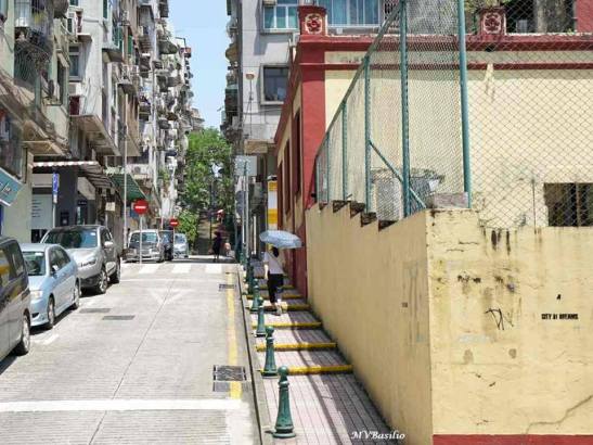 Calçada Central de S. Lázaro, vista da Rua do Volong. Do lado esquerdo, todas as casas antigas foram já demolidas, para dar lugar à construção de prédios de 5 ou mais pisos. No canto do lado direito, existiu uma casa, onde viveu um militar português, conhecido por Capitão Cortês