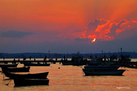 Os barcos de pesca e para lazer enriquecem o cenário ao colocá-los no primeiro plano e o sol se pondo ao fundo.