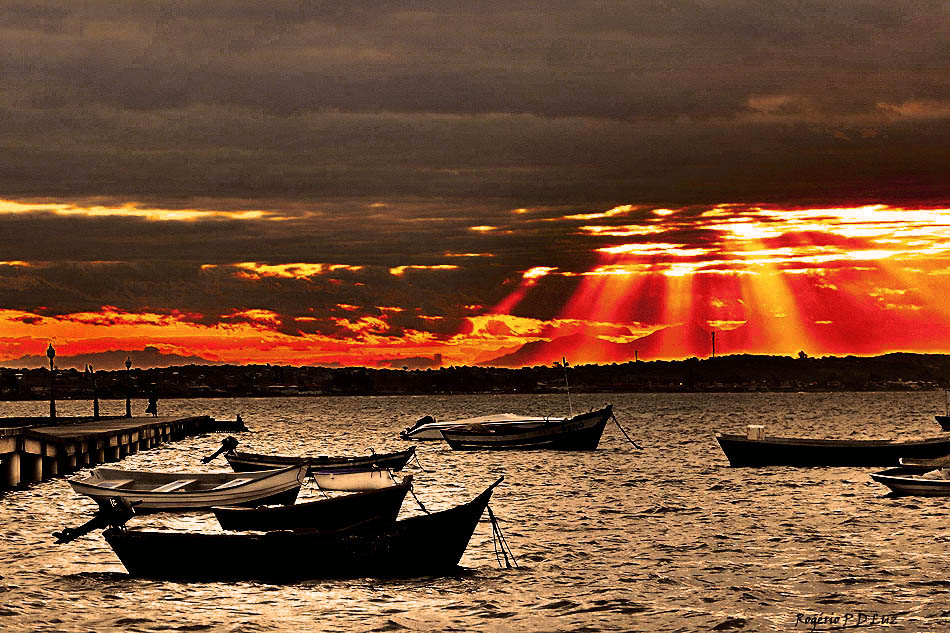 Os barcos de pesca e para lazer enriquecem o cenário ao colocá-los no primeiro plano e o sol se pondo ao fundo.