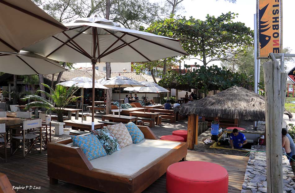 A praia tem boa oferta de restaurantes e bares. A época era a Copa do Mundo de 2018 e muita gente se aglomerou num dos bares para assistir a um dos jogos das oitavas de final e lá ficamos por um tempo tomando água de coco.