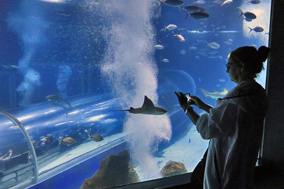 Abaixo, a entrada para o túnel do Recinto Oceânico e de Mergulho, com 3,5 milhões de litros de água e sete metros de pé-direito.