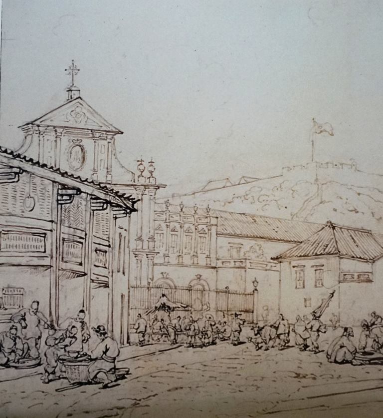 Desenho de George Chinnery, em que se vê parcialmente a fachada da igreja de S. Domingos, bem como o Convento anexo à igreja e, ainda, muitos vendilhões instalados no Largo de S. Domingos