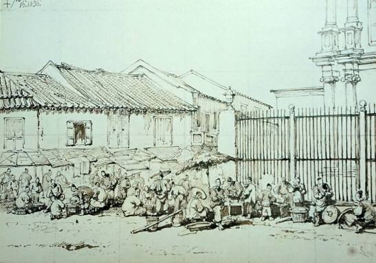 Comércio de rua, com vendilhões instalados junto à igreja de S. Domingos. Desenho de George Chinnery, no ano de 1836