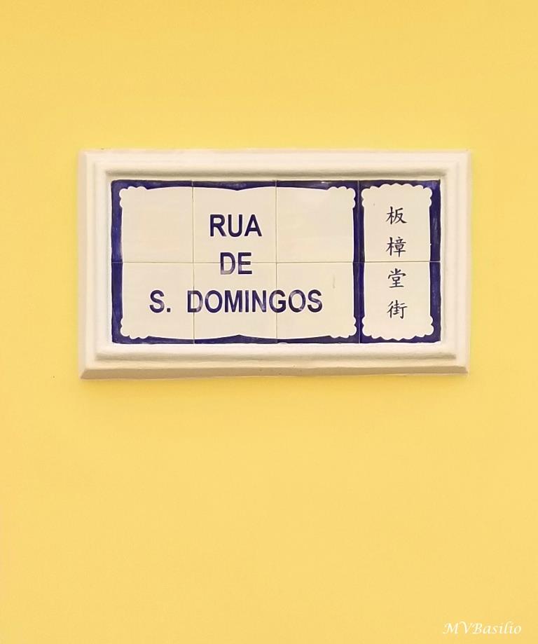 Placa toponímica da Rua de S. Domingos, um modelo adoptado antes da transição de soberania e que ainda não foi substituído pelo actual modelo.