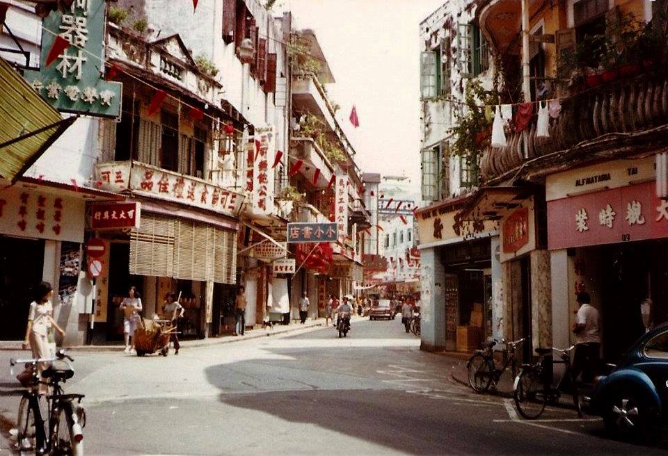 Rua de S. Domingos, próximo do cruzamento com a Travessa da Sé (lado direito, a seguir ao edifício amarelo, onde outrora estava “UN CHI HONG”, conhecida por loja americana) e a Rua da Palha (lado esquerdo)