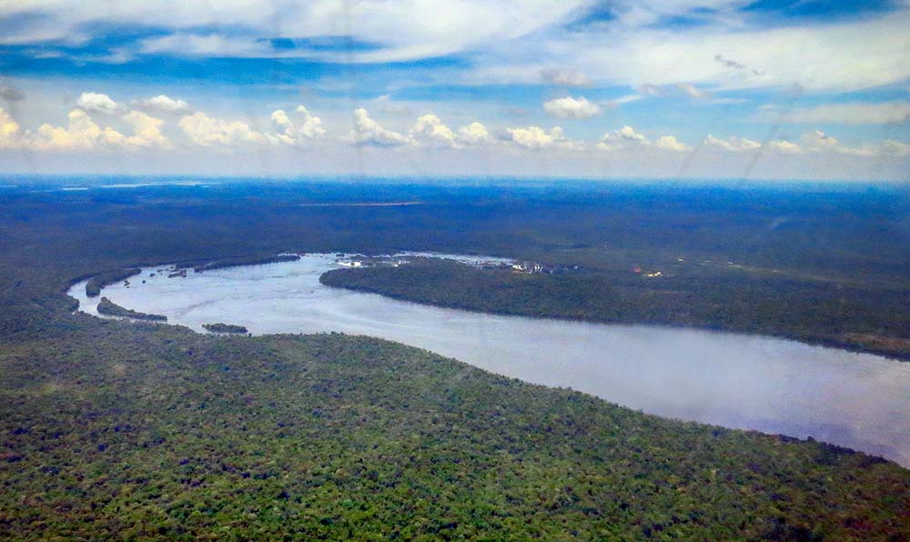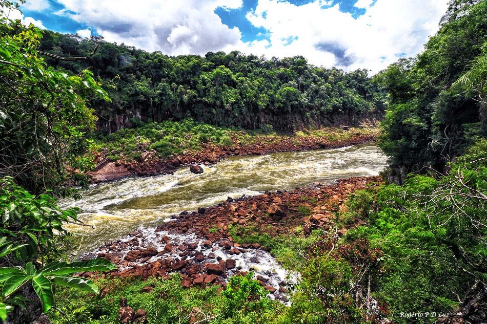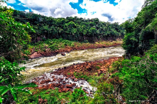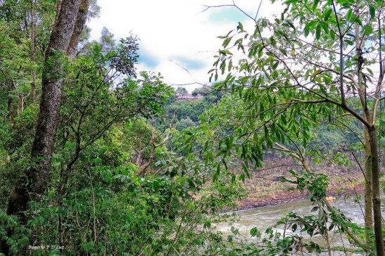 Rio Iguazú. No meio do rio fica a divisa dos dois países, Argentina e Brasil. Na mata do outro lado ficam os mirantes brasileiros.