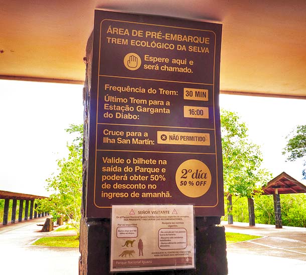 Placa informa a saída do trem a cada 30 minutos, porém no dia, domingo, estava saindo a cada 15 minutos. Se for visitar outro circuito no dia seguinte, valide o ingresso e pague com desconto de 50%.