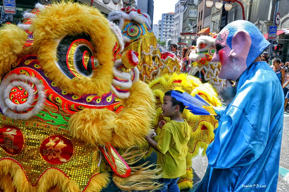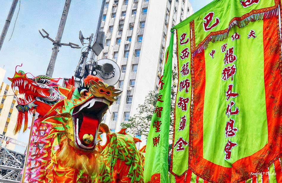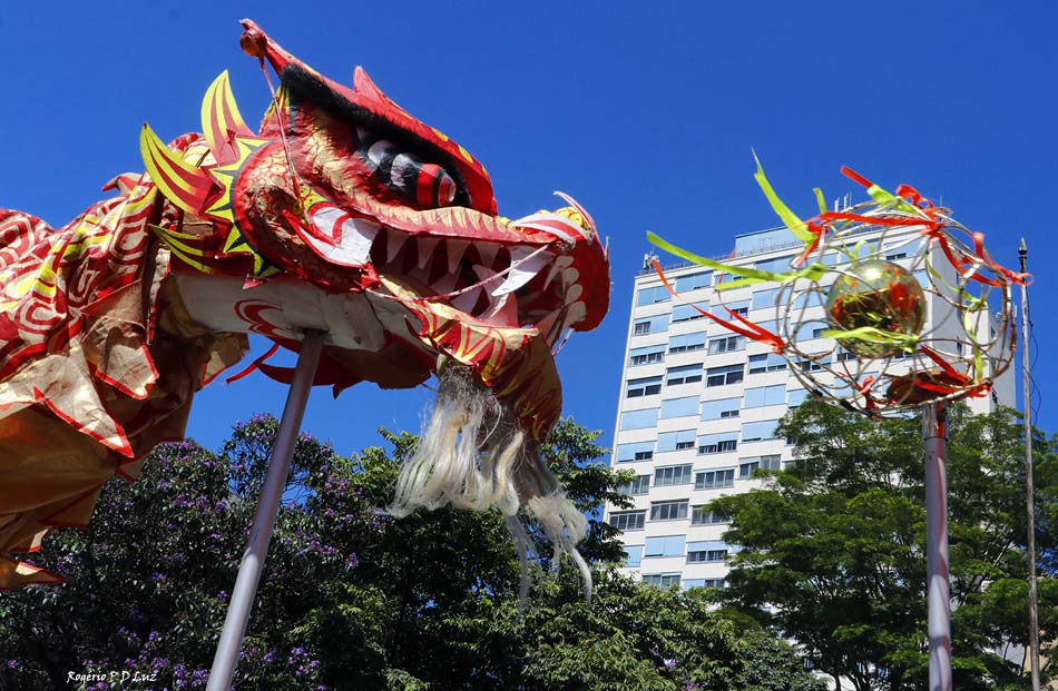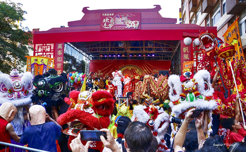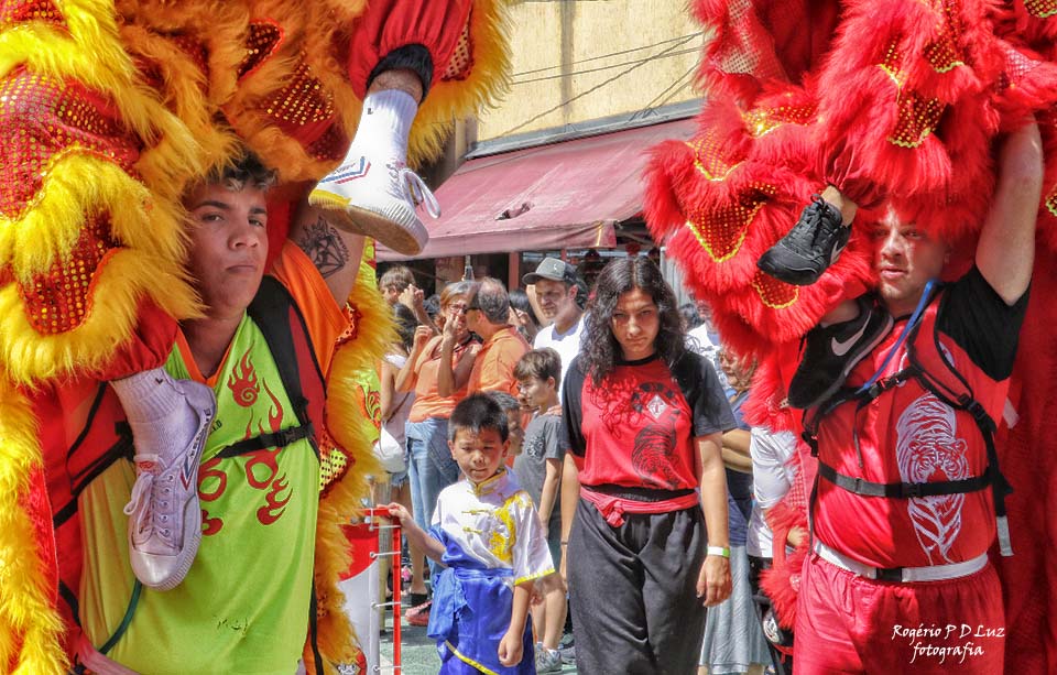 Nesta postagem mostramos o desfile e apresentação da Dança do Dragão e a Dança do Leão. Na postagem seguinte são mostradas imagens das apresentações variadas no palco, com artes marciais, danças típicas e modernas, música, cabaias chinesas …