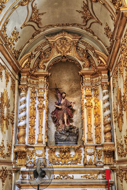 A talha dourada em estilo rococó do interior, de grande beleza, foi realizada por mestre Inácio Ferreira Pinto a partir de 1785.