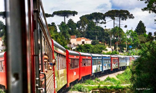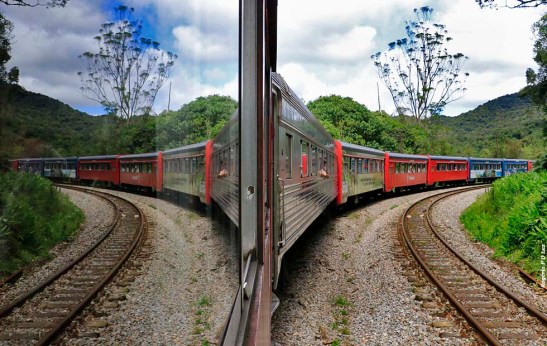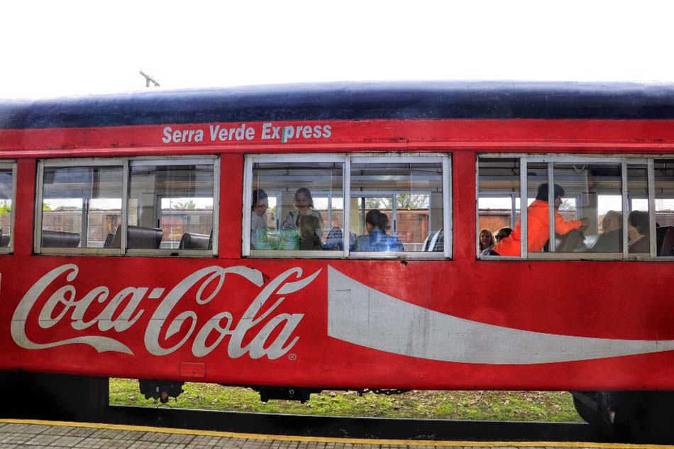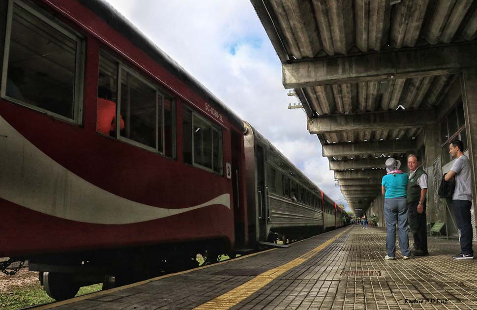 Como viajamos de excursão pela Ivetur Turismo. não tivemos preocupação em comprar passagens. apenas embarcar na van que nos transportou à estação para tomar o trem que nos levaria à tão sonhada viagem. Porém o melhor que vocês podem fazer, se forem viajar por conta própria, é visitar o site oficial da transportadora – Serra Verde Express – no https://www.serraverdeexpress.com.br e escolherem o pacote que mais se adapte às suas pretensões, pois são várias opções. Qualquer orientação minha aqui poderia sofrer alteração a qualquer momento. tal como no dia, o trem de luxo, Litorina de Luxo, não iria partir. Viajamos no trem de Classe Turística que partiu às 08:30 horas, o mais utilizado pelos turistas. São bancos simples mas como você perde todo tempo na janela que se abre, vendo a sequência de paisagens, pontes e túneis, isso acaba não tendo a mínima importância.