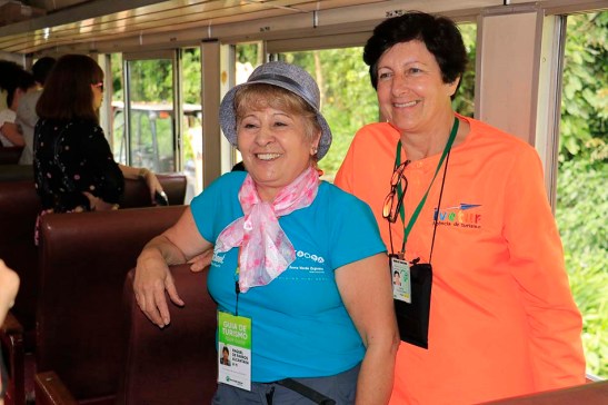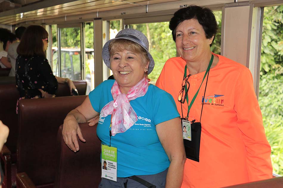 Cada vagão tem seu guia de turismo. No nosso, era a simpática Raquel (à esquerda) que posou para fotos com a tão simpática Ivete da Ivetur Turismo que assessorou a nossa excursão. A Raquel que serviu água ou refrigerante e um lanchinho, já incluído no preço da passagem, ia contando a história da ferrovia e nos alertava para olhar para o lado que tinha de uma paisagem interessante, uma cachoeira, montanha, construção, ponte etc.