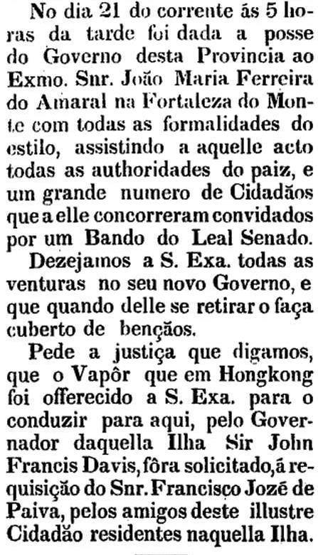 Devido ao agravamento da situação económico-financeira e da crise existente, o bispo de Macau, D. Jerónimo da Mata, solicitou ao Governo de Lisboa o envio de um governador, dotado de firmeza e determinação, capaz de solucionar o estado das coisas que se alastrava há vários anos. A escolha de uma personalidade com este perfil e de confiança do então Ministro da Marinha e Ultramar recaiu em João Maria Ferreira do Amaral, um distinto oficial da Marinha, agraciado com a Comenda da Ordem de Avis, em 1840, pelos valiosos serviços prestados à Pátria. Após a sua nomeação para o cargo, partiu de Lisboa em Janeiro de 1846, tendo chegado a Hong Kong no dia 18 de Abril do mesmo ano, pelo vapor Lady Mary Wood. Na manhã de 19 de Abril, rumou para Macau a bordo do vapor de guerra inglês Pluto, “que lhe fora oferecido por o conduzir para Macau pelo Governo daquela Cidade, aqui desembarcou de perfeita saúde, às 2 horas da tarde, e foi recebido com todas as honras que lhe são devidas”. Dois dias depois, ou seja, no dia 21 de Abril, pelas 5 horas da tarde, foi dada a posse do Governo da Província a João Maria Ferreira do Amaral, na Fortaleza do Monte, com todas as formalidades do estilo, assistindo ao acto todas as autoridades e um grande número de cidadãos, a convite do Leal Senado.