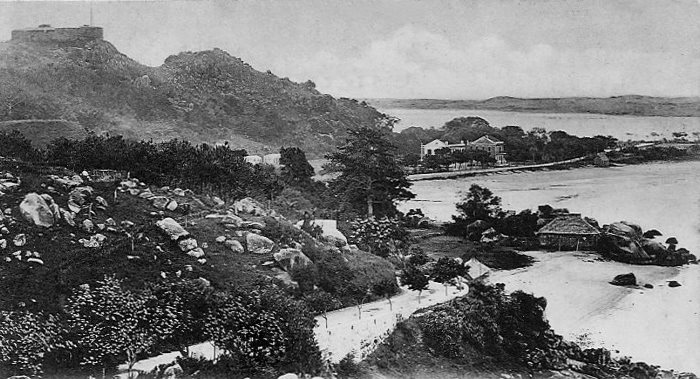 Ao fundo, vê-se a colina de Mong-Há, no cimo do qual está a fortaleza, cuja estrutura principal foi erguida em 1849 por determinação do então governador Ferreira do Amaral, com a função de defesa do sector norte de Macau. Vê-se ainda o Campo entre a zona arborizada e a colina de Mong-Há e, do lado direito, a nova Avenida de Vasco da Gama e, também, um troço da antiga Estrada do Campo, que corresponde à actual Avenida de Sidónio Pais. Do lado esquerdo, vê-se a capela do Cemitério de S. Miguel Arcanjo. Ao centro, a povoação e o campo de Tap Siac.