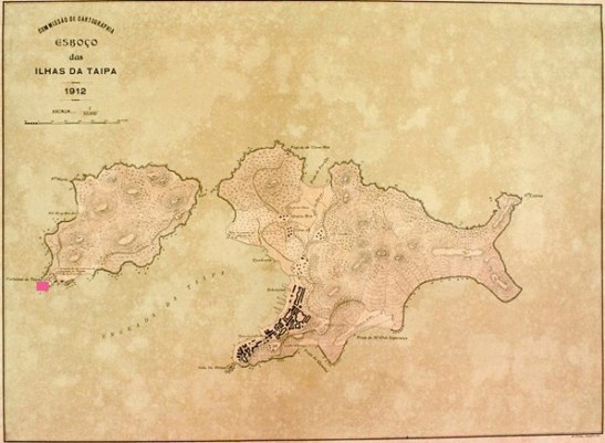 Mapa das ilhas da Taipa, em 1912. Do lado esquerdo, o rectângulo cor de rosa assinala a localização do Forte da Taipa, que o governador Ferreira do Amaral mandou construir.