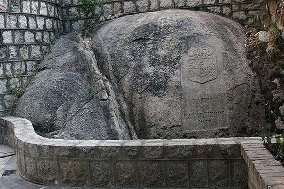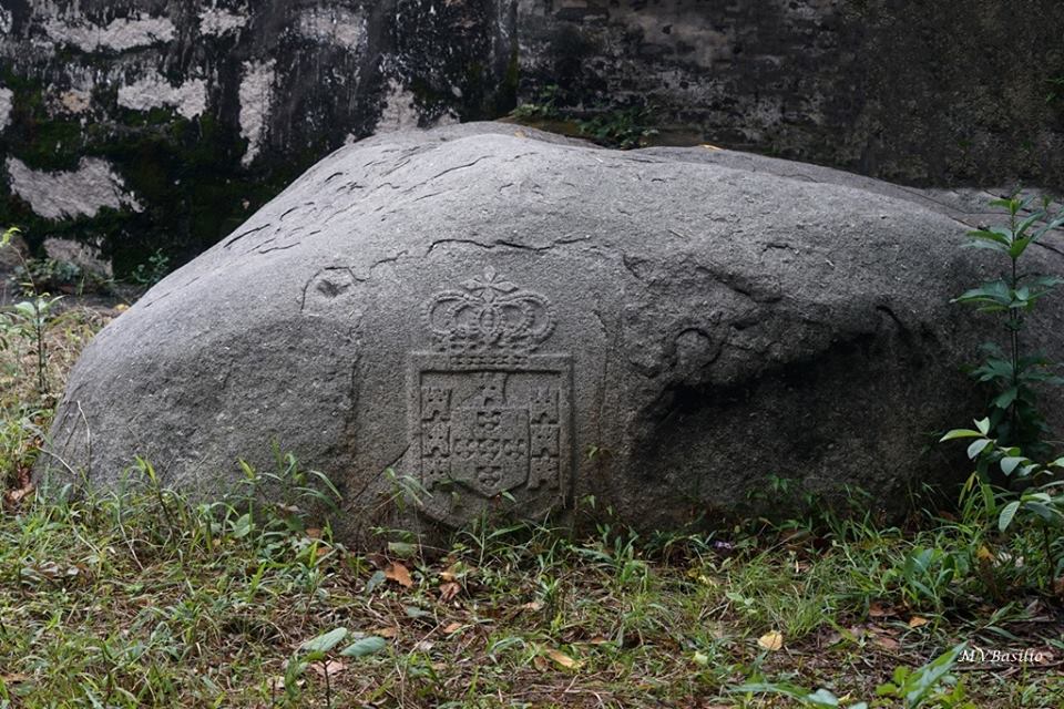 Rocha junto ao Templo Lin Fong, em que está gravado o brasão de armas da monarquia portuguesa. Consta que foi gravado em 1848, para servir de marco fronteiriço. Este marco serve também para assinalar, aproximadamente, o local onde, em 22 de Agosto de 1849, Ferreira do Amaral foi assassinado. Foto Manuel V.Basílio