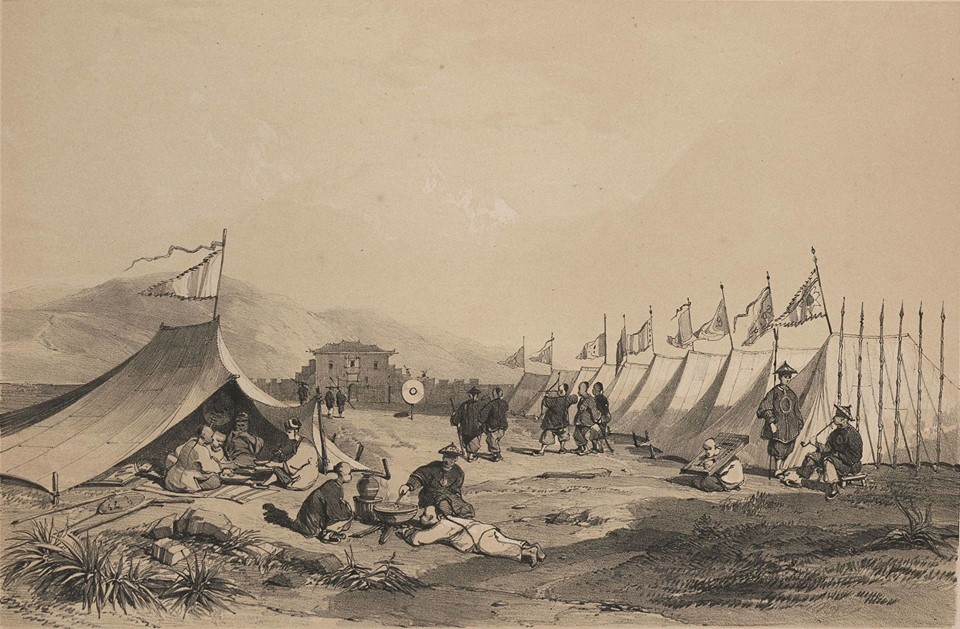 Acampamento de tropa chinesa junto à Porta do Cerco (Desenho de Auguste Borget, publicado em 1842)