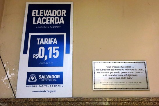 O Elevador Lacerda é o primeiro elevador urbano do mundo. Em 8 de dezembro de 1873, quando foi inaugurado, era o mais alto do mundo, com 63 metros. cumpre a função de transporte público entre a Praça Cairu, na Cidade Baixa, e a Praça Tomé de Sousa, na Cidade Alta. Do alto de suas torres, descortina-se a vista para a Baía de Todos-os-Santos, o Mercado Modelo e, ao fundo, o Forte de São Marcelo.