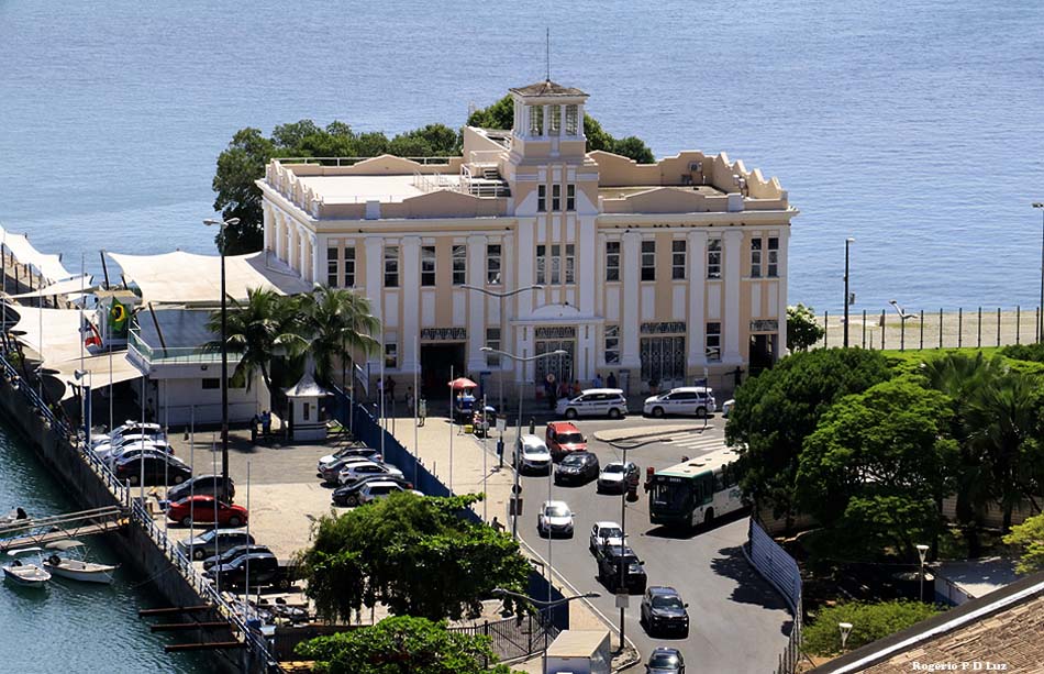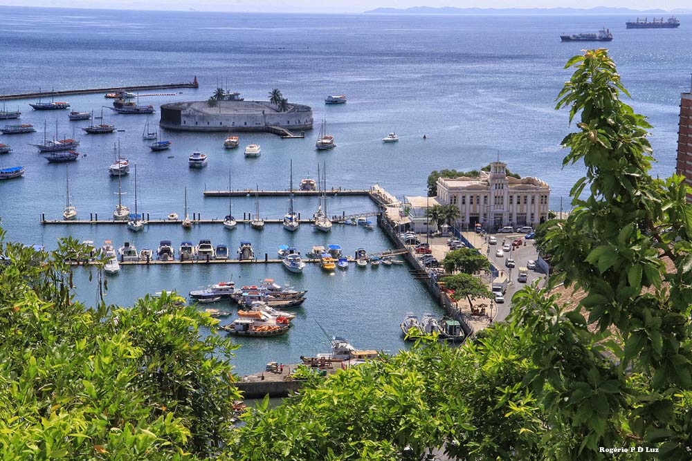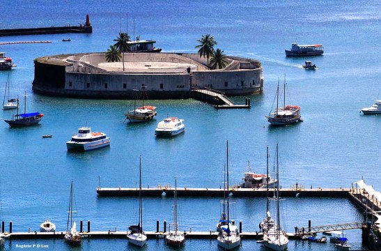 O Forte São Marcelo no mar e o prédio (à direita) do Terminal Turístico Náutico da Bahia, na Cidade Baixa
