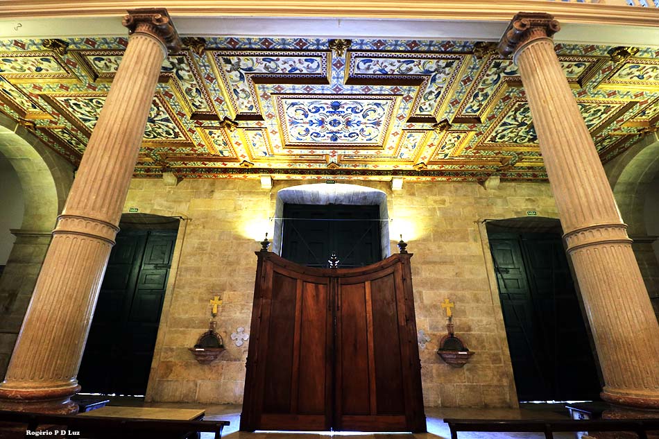 O teto é decorado com pintura em caixotões, mostrando mártires e apóstolos jesuítas junto com motivos florais em estilo maneirista.