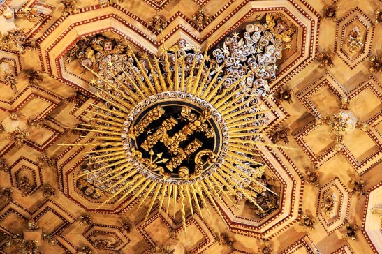 Medalhão radiante com o monograma IHS (Iesus Hominum Salvator – Jesus Salvador dos Homens), o símbolo da Companhia de Jesus.