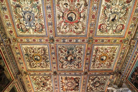 O teto é decorado com pintura em caixotões, mostrando mártires e apóstolos jesuítas junto com motivos florais em estilo maneirista.