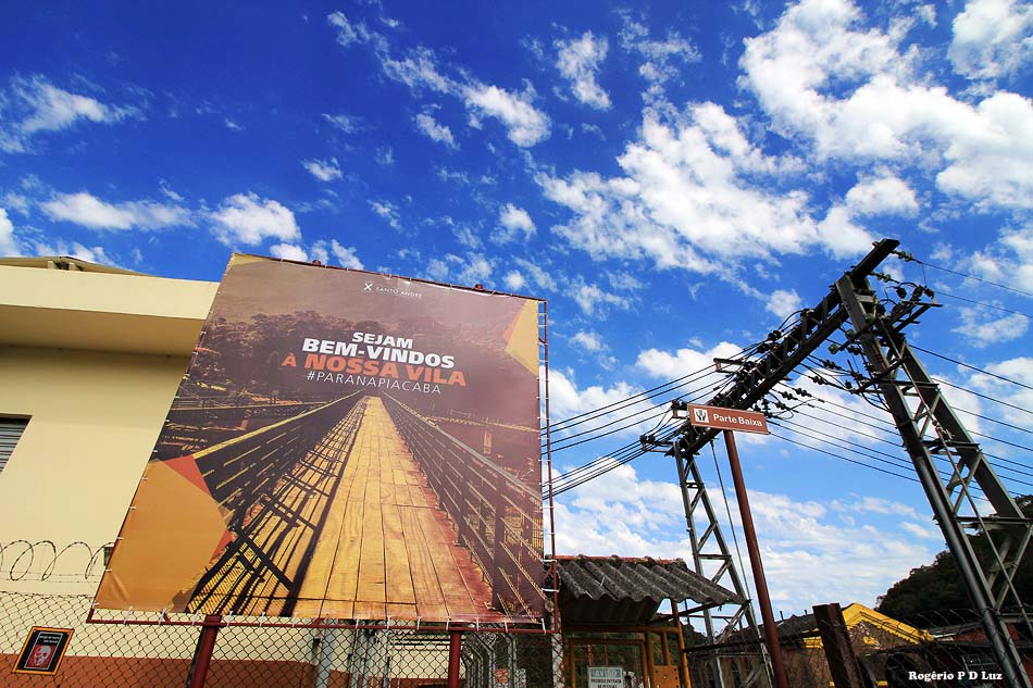 A Parte Baixa de Paranapiacaba. Cartaz saúda os visitantes.