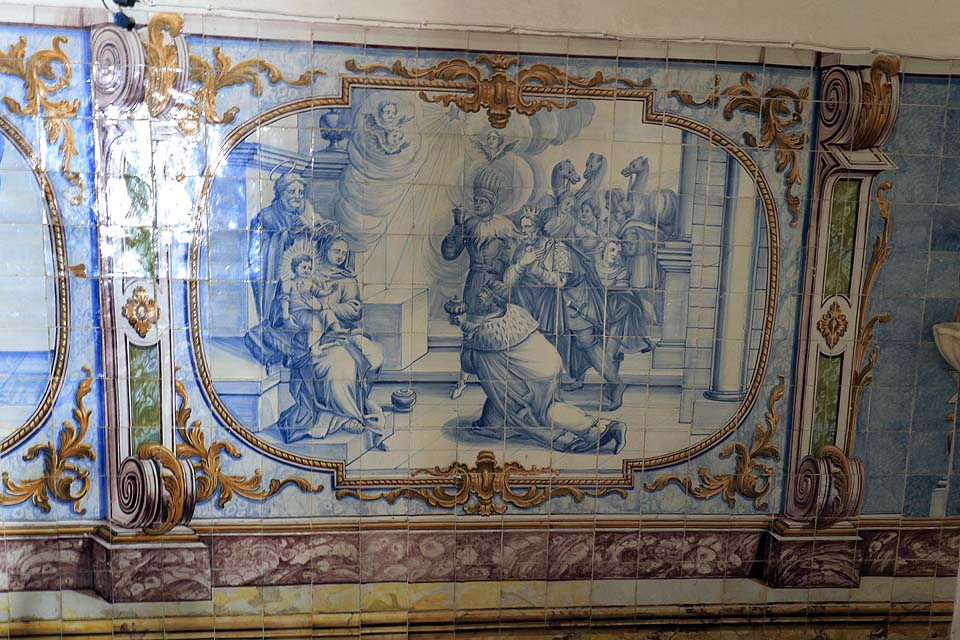 Azulejos sobre a devoção ao Rosário, fabricados em Portugal e datados de c. 1790.