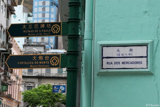 Placa toponímica da Rua dos Mercadores, cujo topónimo em chinês é “Tái Kái” 大 街 , ou seja, “a rua grande”, que no passado era a via principal do Bazar grande. O nome alternativo, em chinês, é “Yêng Tei Tái Kai” 營地大街 , escrito entre parêntesis, cujo nome não constava dos Cadastros das Vias Públicas e Outros Lugares da Cidade de Macau de 1905 e 1925. Foto MV Basílio