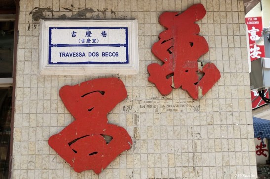 Placa toponímica da Travessa dos Becos. Deveria ter sido uma via com diversos becos, no entanto, em chinês, é designada “Kât Heng Hong” ( Kât Heng 吉慶 , Auspicioso), também conhecida por “Kât Heng Lei” (“Lei” quer dizer Beco e, “Hong”, Travessa. Foto MV Basílio