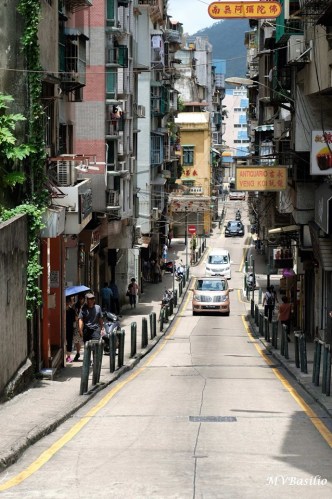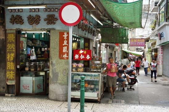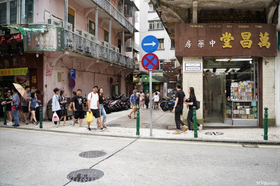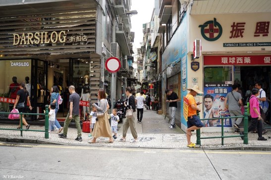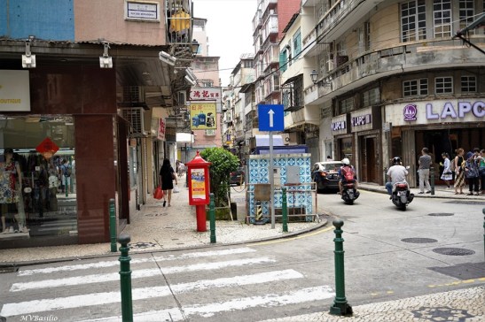 A via situada à direita é a Travessa dos Algibebes. O troço da Rua dos Mercadores, que vai do prédio de cor ocre até aproximadamente onde circula um táxi preto, era outrora designado, em chinês, “Sék Cháp Mun”, devido um portal ou porta de pedra que ali existiu. Foto MV Basílio