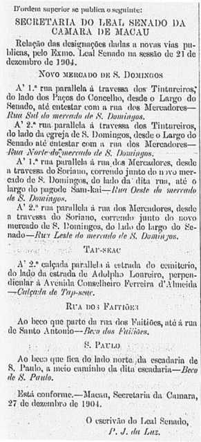 Designações de novas vias públicas, dadas pelo Leal Senado à zona do novo Mercado de S. Domingos, em 27 de Dezembro de 1904.