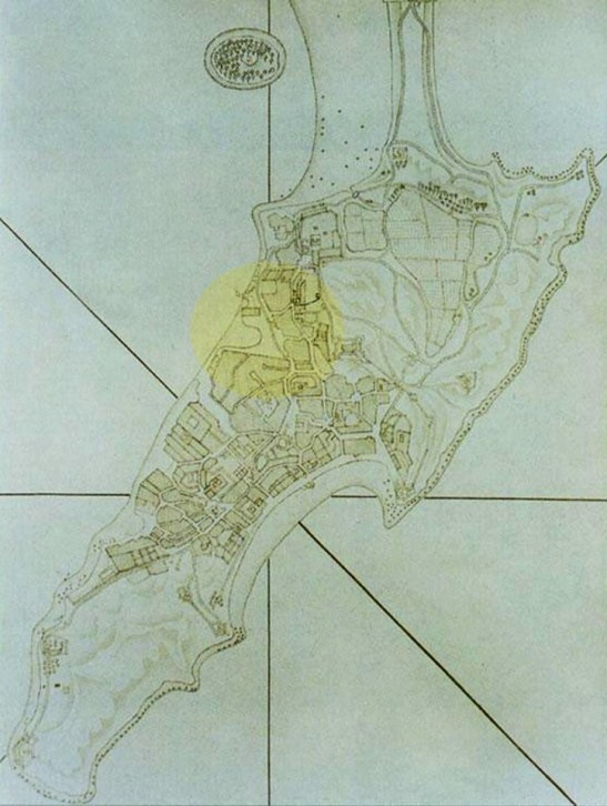 Mapa de princípios do século XIX. O círculo assinalado a amarelo mostra o local da Praia Pequena e a reentrância da linha da costa antes dos aterros.