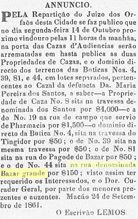 (11) Há um anúncio judicial, datado de 24 de Setembro de 1861, referente a arrematação em hasta pública de uma casa “sita na rua denominada Bazar grande”, bem como um edital, datado de 7 de Agosto de 1865, em que faz a menção da “rua grande do Bazar”. A “rua grande” é tradução literal da designação, em chinês, “Tái Kái”.