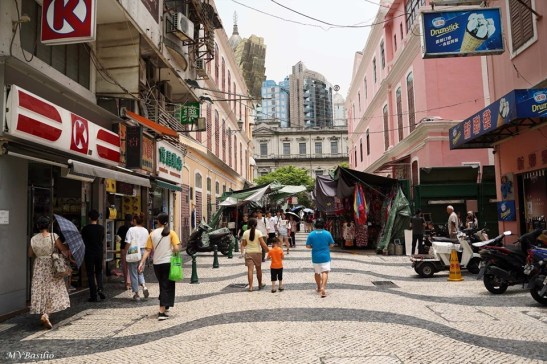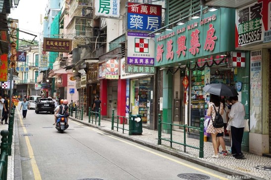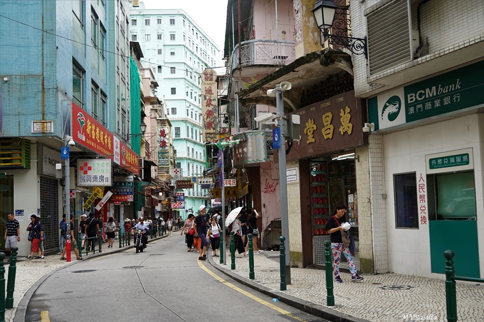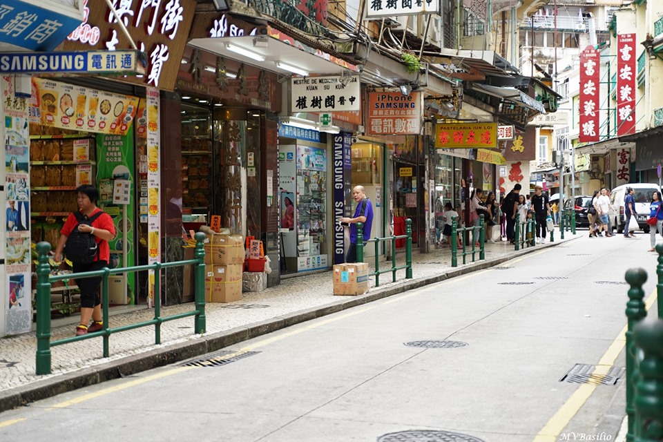 A via situada à direita é a Travessa dos Algibebes. O troço da Rua dos Mercadores, que vai do prédio de cor ocre até aproximadamente onde circula um táxi preto, era outrora designado, em chinês, “Sék Cháp Mun”, devido um portal ou porta de pedra que ali existiu. Foto MV Basílio