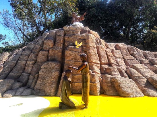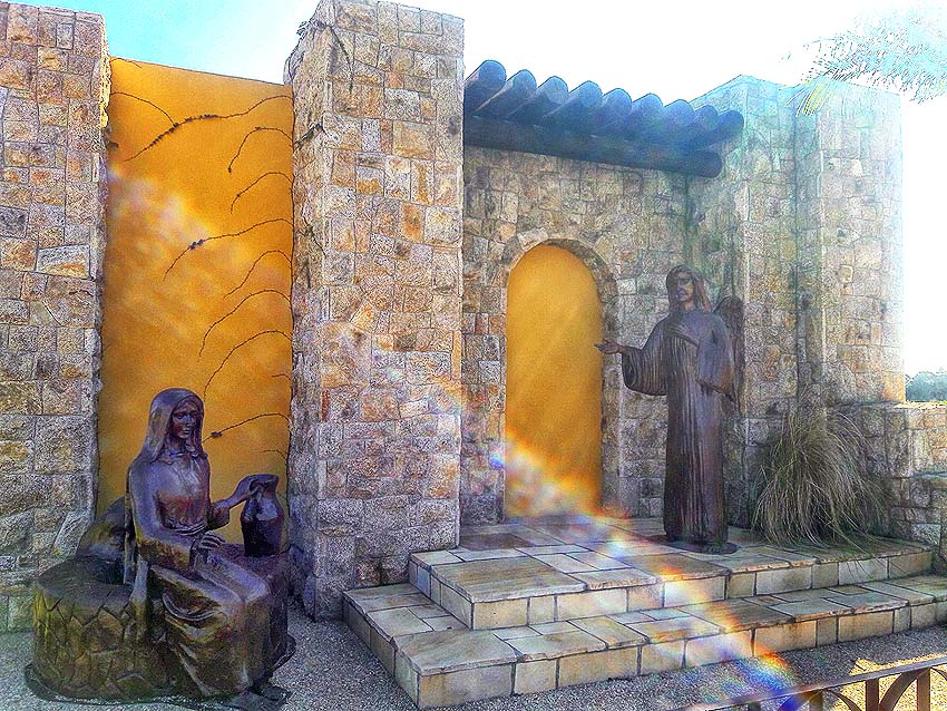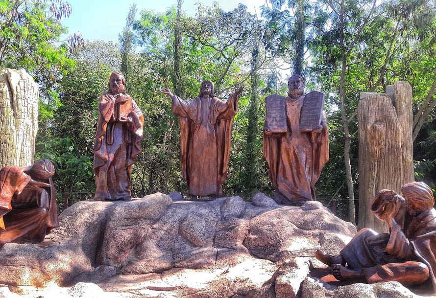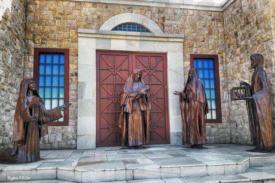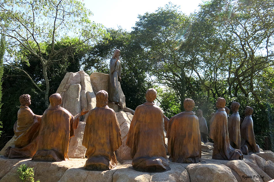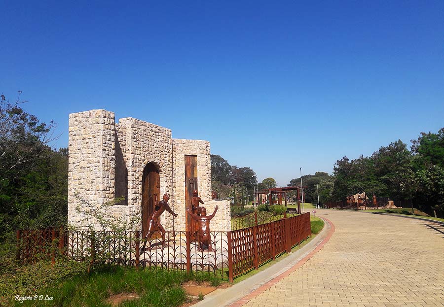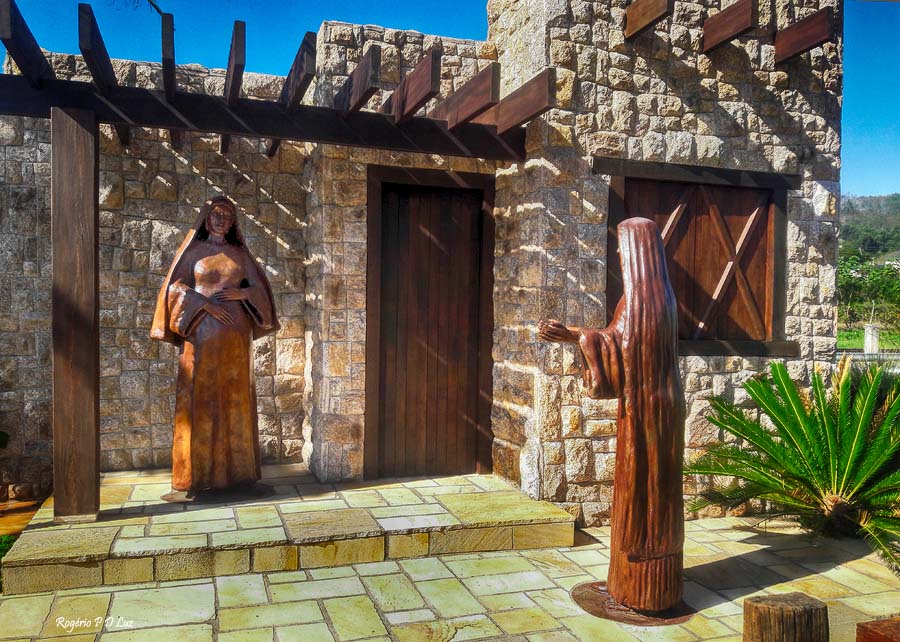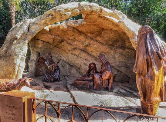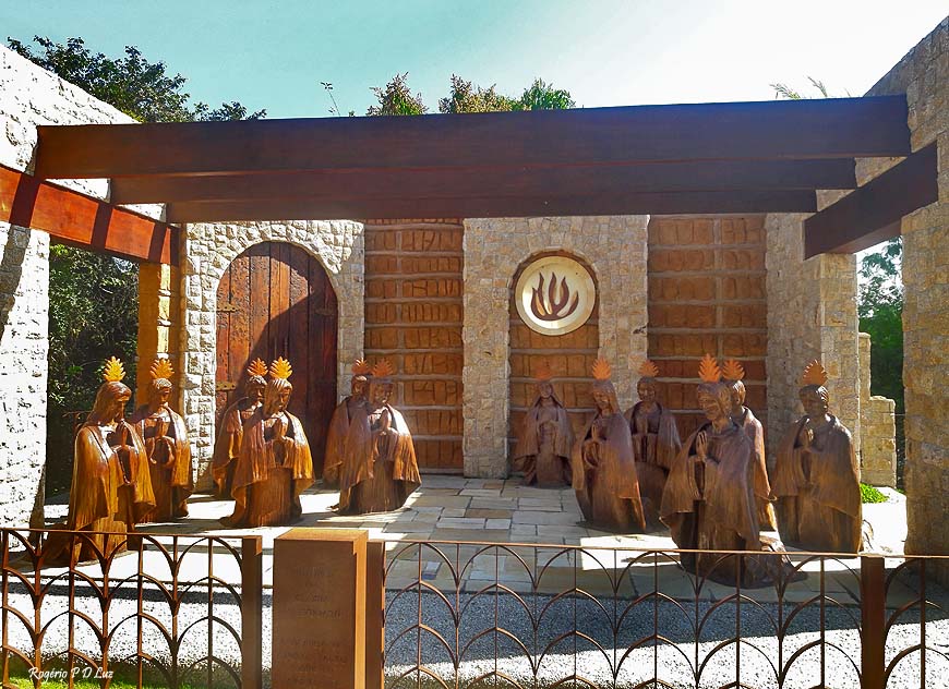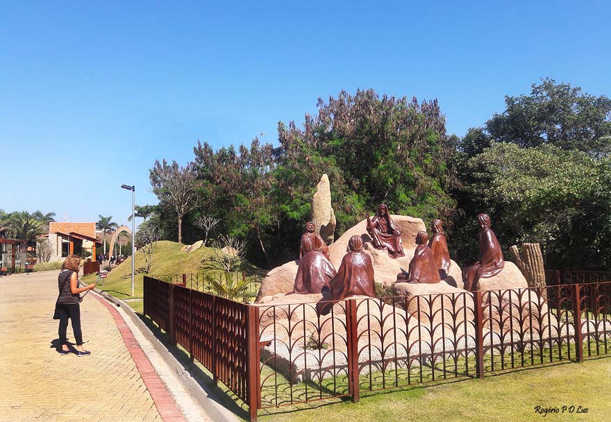 Vinte cenários com um total de 128 esculturas criadas pelos artistas paraguaios Blas e Angela Servín, estão montados em todo o percurso totalmente plano e com entrada gratuita, apresentando os quatro Mistérios do Rosário assim divididos em Gozosos, Dolorosos, Gloriosos e Luminosos. Cada um dos quatro Mistérios contém cinco cenários com simbologia diferente através de flores e cores. Informação dada à imprensa por padre Daniel Antonio da Silva, administrador ecônomo do Santuário Nacional de Aparecida, diz que “o local foi pensado a partir de cenários. Em cada mistério tem diferentes simbologias, por exemplo, os mistérios dolorosos são mais introspectivos e usam as cores roxo e vermelho escuro. Já as partes da anunciação usam cores alegres, com flores brancas e amarelas”.