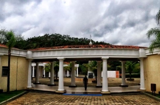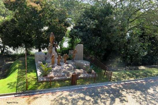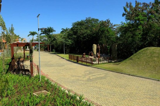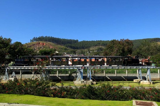 O único monotrilho elétrico por onde percorre o Trem do Devoto. Abaixo, no início do Caminho do Rosário, no canteiro central, a benção com a imagem de Nossa Senhora Aparecida.