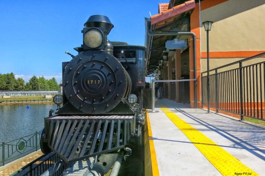 O prédio do Hotel Rainha do Brasil pertencente ao Santuário, ao lado do início do Caminho do Rosário e da Cidade do Romeiro. Na foto abaixo, o trem se aproxima do final da viagem para parar na Estação Cidade.
