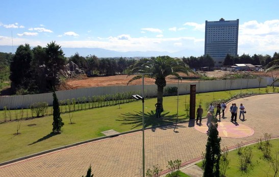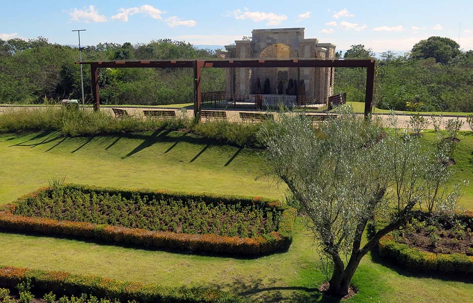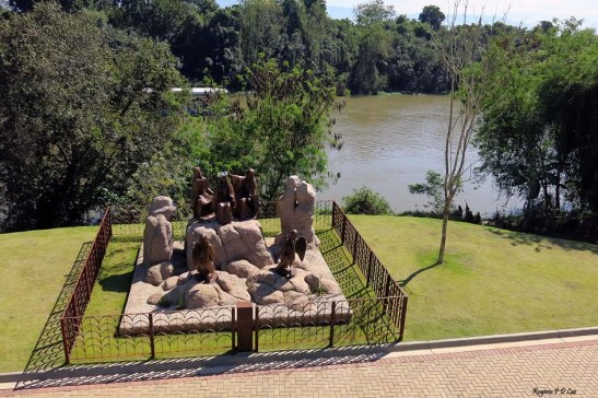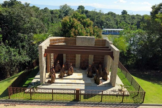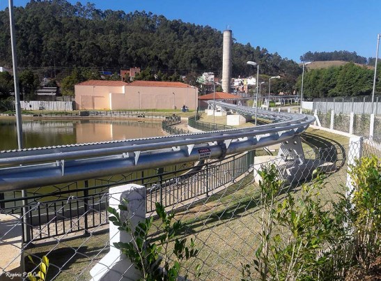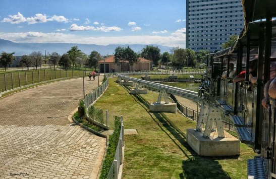 O monotrilho percorre paralelamente ao Caminho do Rosário com 20 cenários e 128 esculturas, para meditação dos mistérios do Terço.