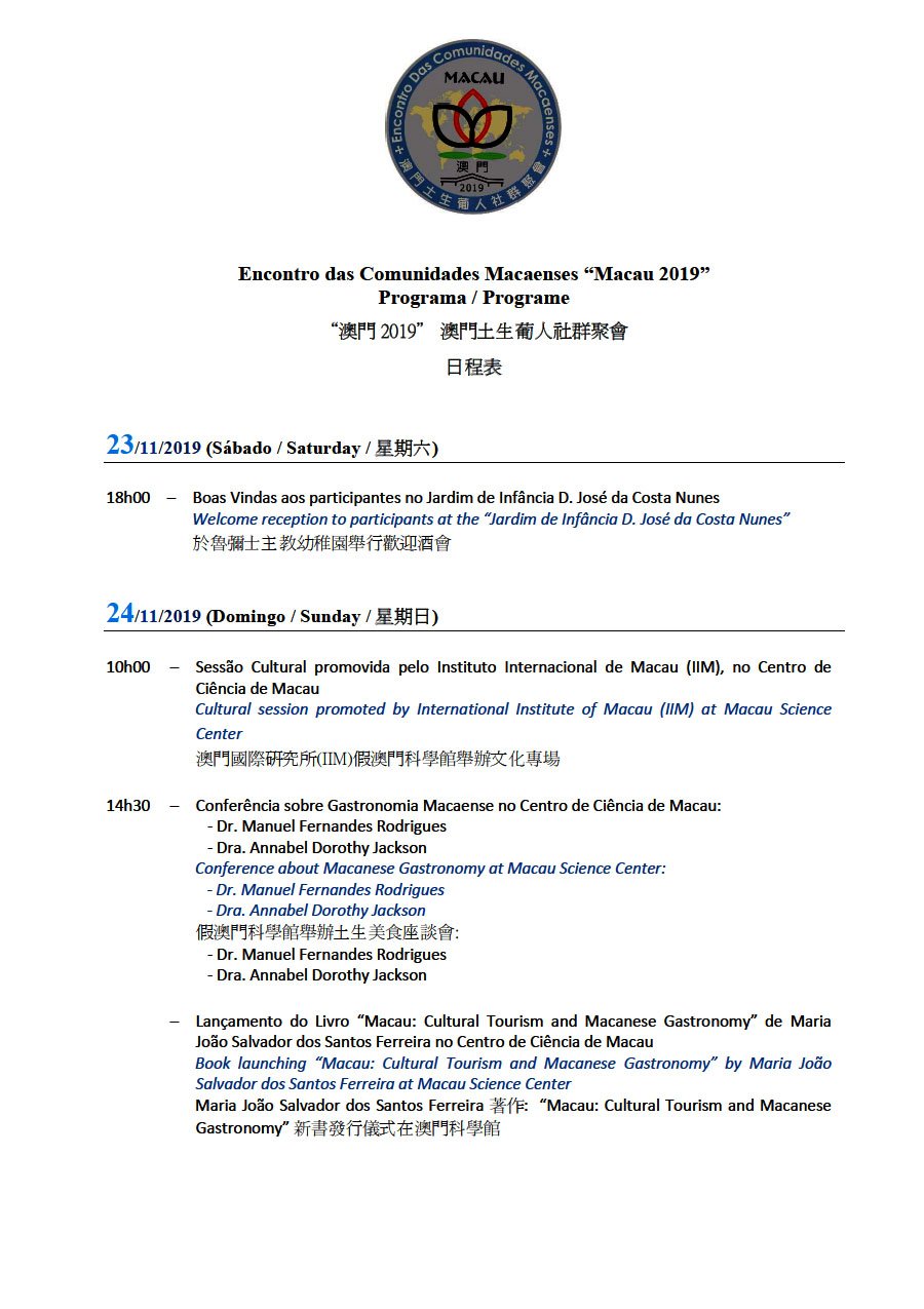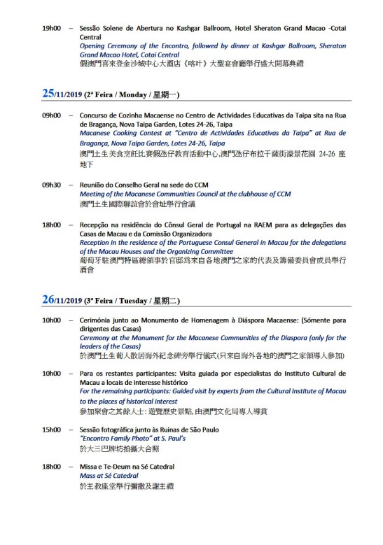 O Conselho das Comunidades Macaenses – CCM, em e-mail enviado às Casas de Macau, divulgou o Programa Final do Encontro das Comunidades Macaenses Macau 2019 e Programação de Autocarros, que terá início em 23/11/2019, encerrando-se no dia 29 com um jantar na Torre de Macau.