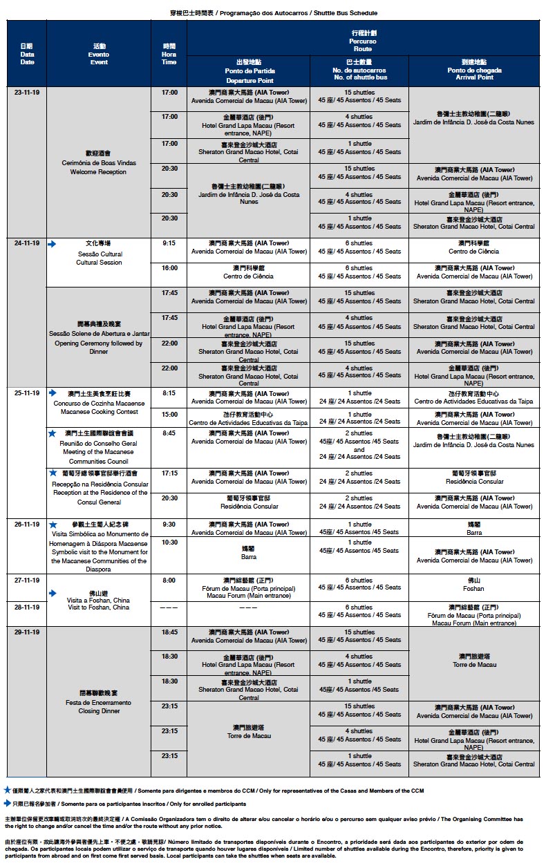 Programação de autocarros – alteração na saída da saída dos autocarros da “AIA Tower” para a Sessão solene de abertura seguido do jantar no Sheraton Grand Macao Hotel no dia 24 de Novembro, que passa a ser às 18H00. Consulte a sua Casa de Macau ou a secretaria do Conselho das Comunidades Macaenses sobre alterações na tabela abaixo.