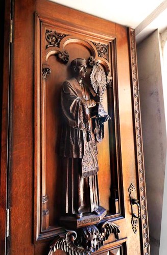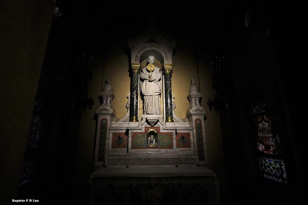 Na torre central, o conjunto escultórico em mármore branco com dois anjos ajoelhados, representa o beato Pedro Julián Eymard, fundador da ordem da Congregação do Santíssimo Sacramento Expuesto.