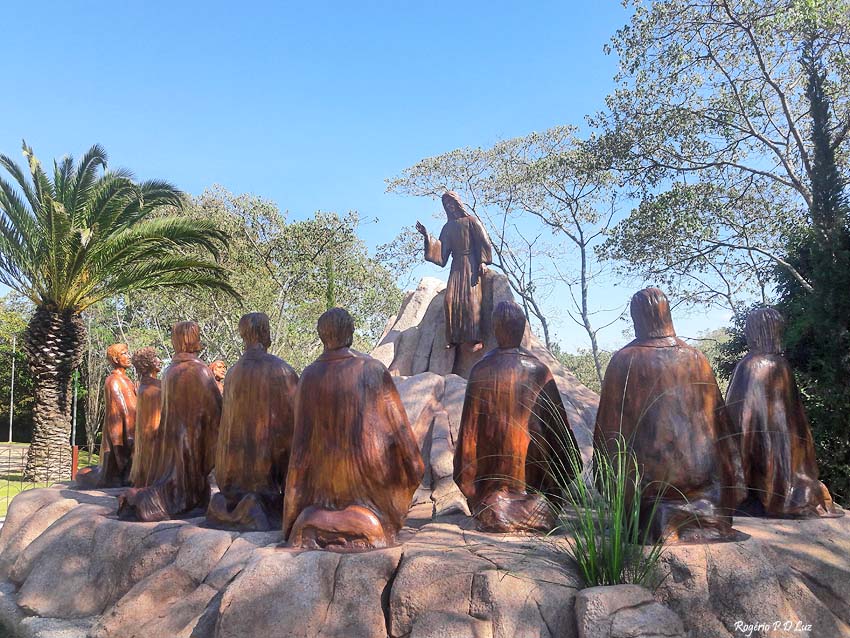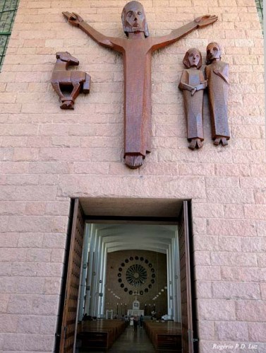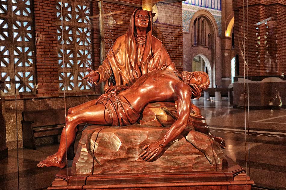 Jesus carregando a cruz desde Pretório até ao Calvário. Santuário de Nossa Senhora Aparecida, em Aparecida, S.Paulo. 4ª estação da Via Sacra: Jesus encontra sua Mãe. A dor de ver sua Mãe sofrendo lhe abre mais feridas no coração. No entanto, ao mesmo tempo, ver o olhar amoroso de Maria o consola.